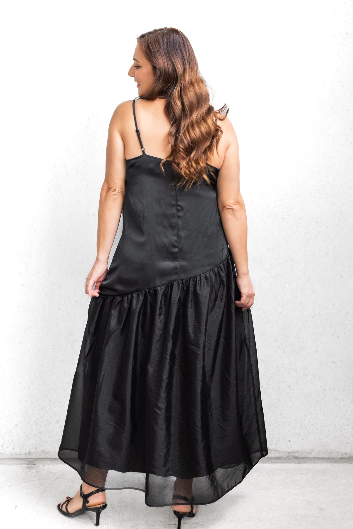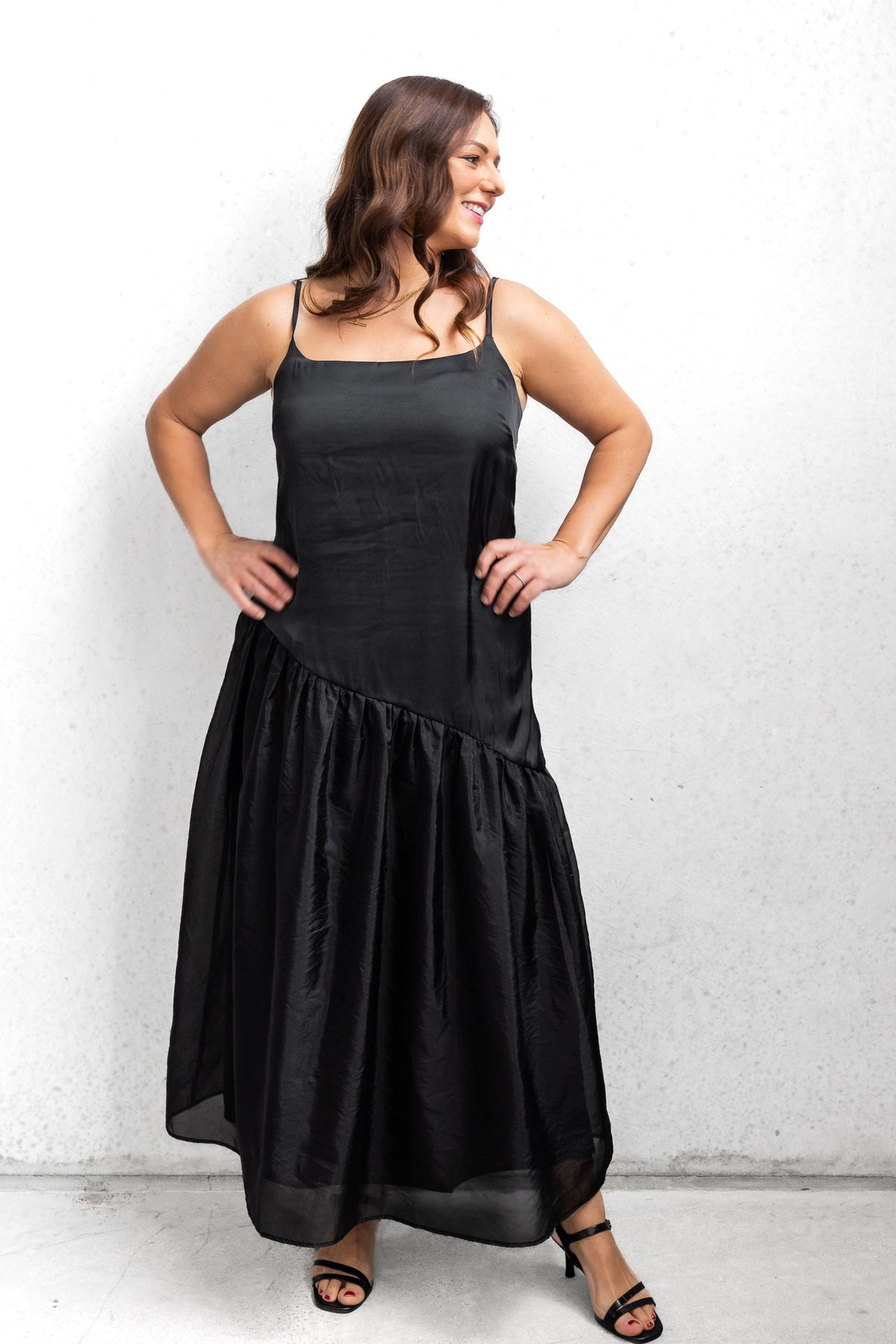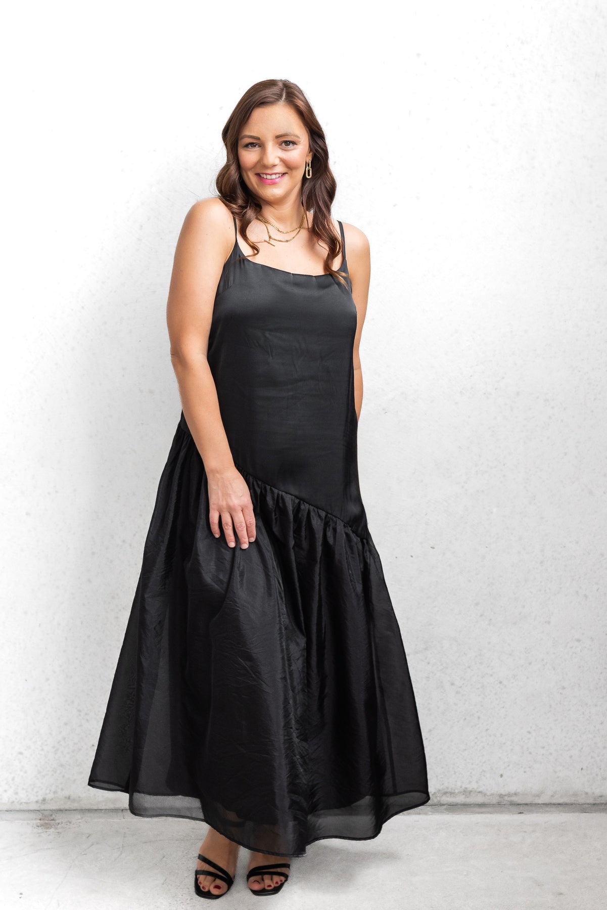 This stunning dress is designed to be worn loose through the middle; (think chic flapper style), with a full layered skirt. She can be super dressy or styled with flats.