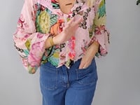 All the fresh Spring feels in this light and flowy blouse.  Featuring a frilled button front, lace shoulder and back detail and an elasticated cuff for wearing as a full length or 3/4 length sleeve.