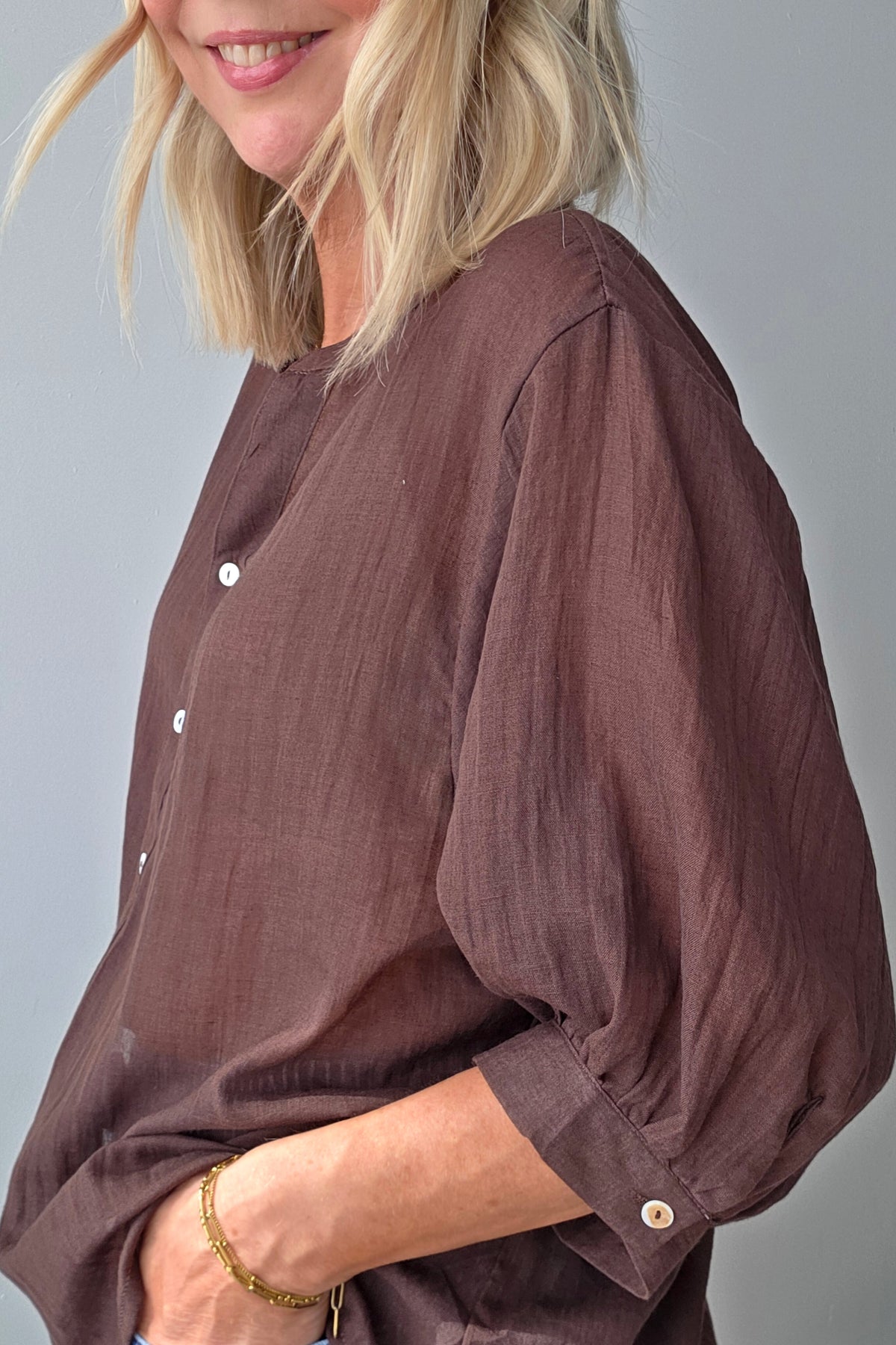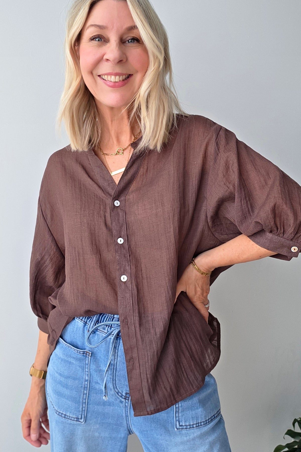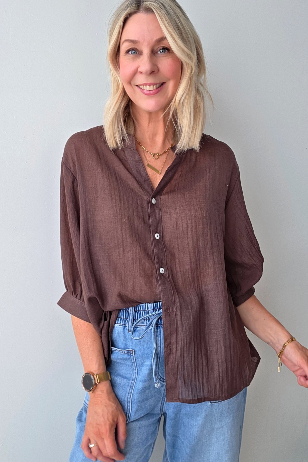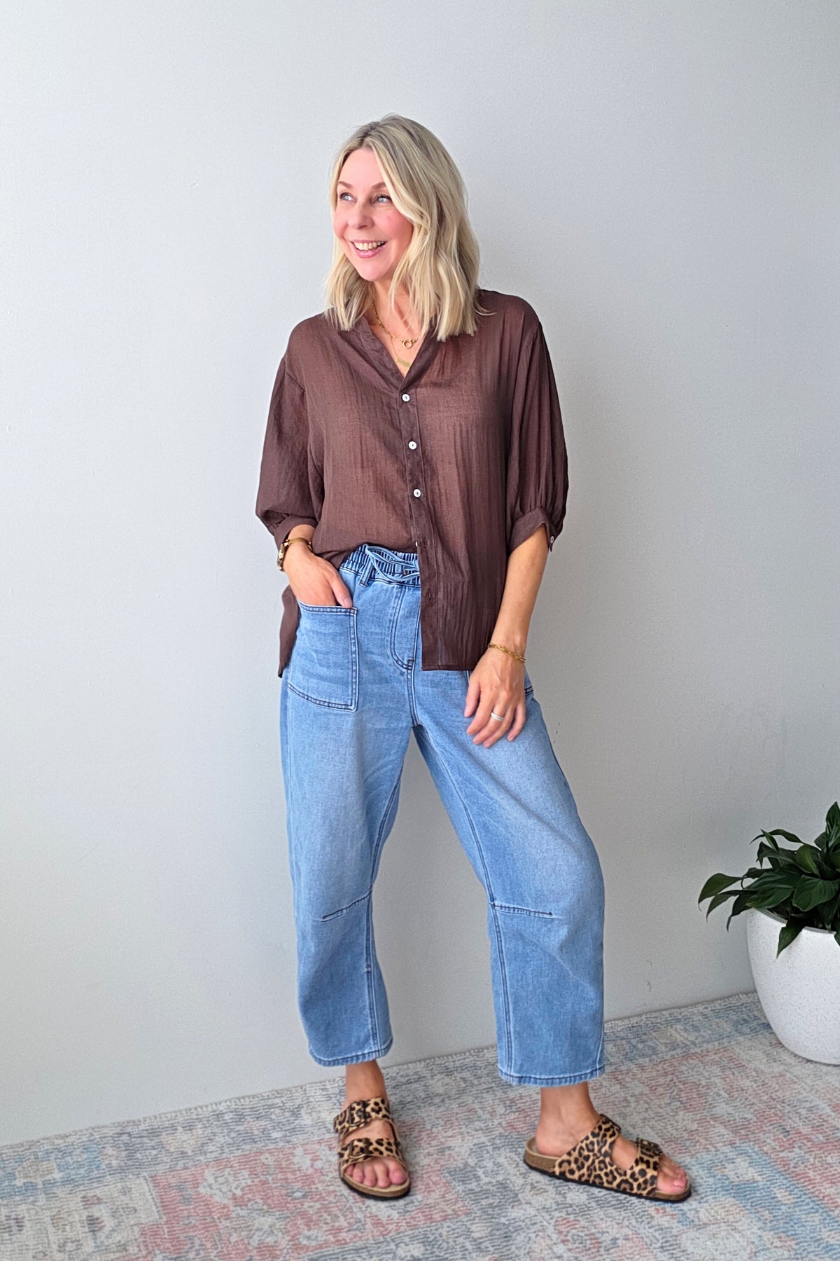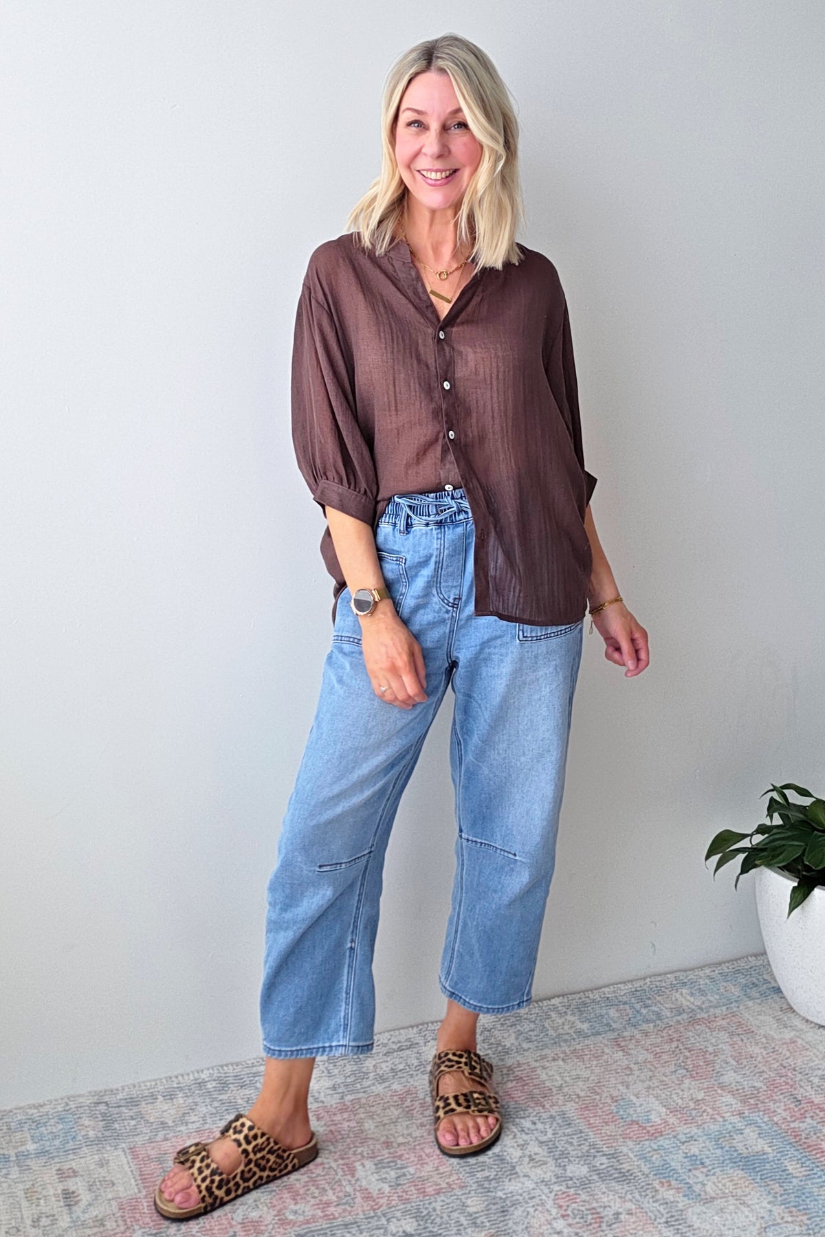 All the sexy feels in this light and airy shirt. The Summer shirt is made from the lightest, slightly sheer cotton blend which offers a perfect piece for a hot day when you still want some arm coverage. She can be worn alone with a nude bra or a nude or white cami underneath. Half tuck, French tuck, or loose over denim; it all works.