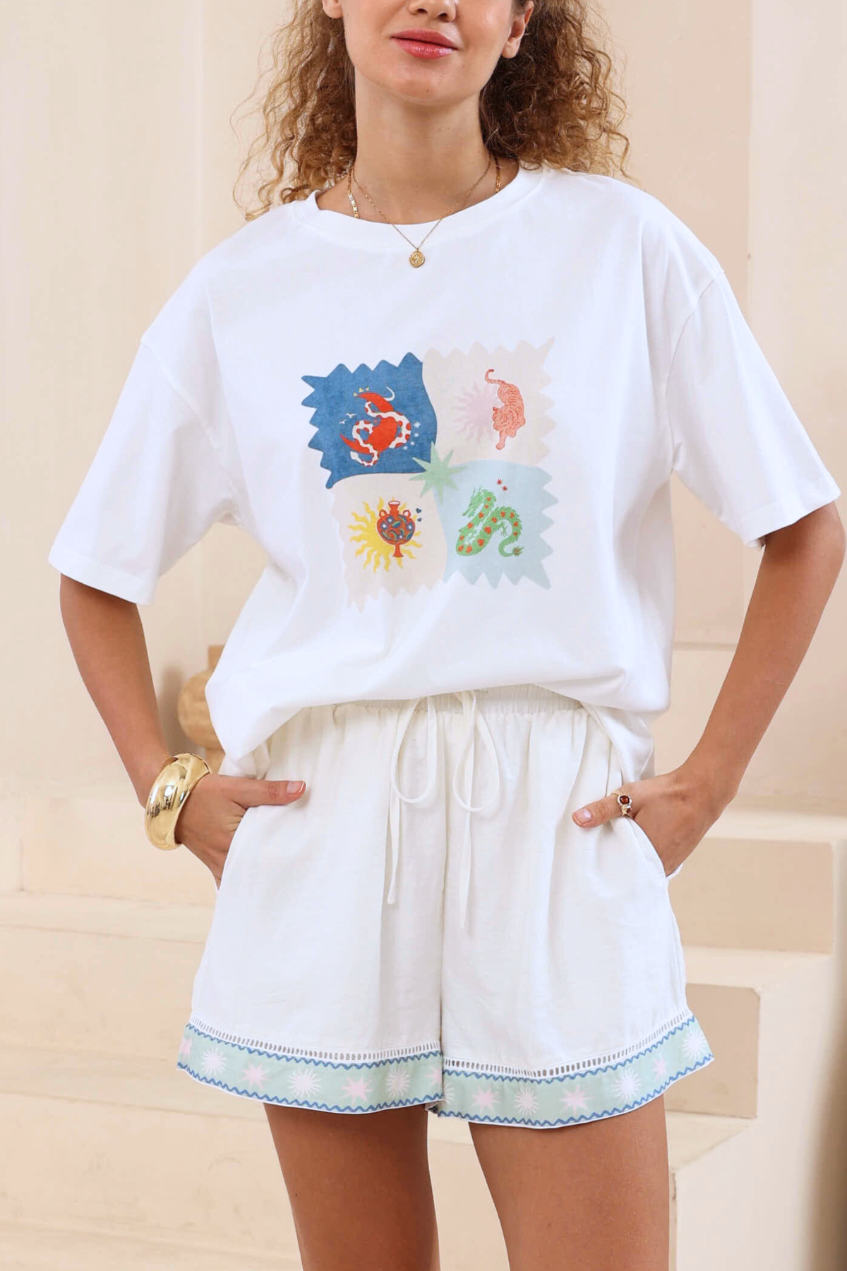 This printed graphic tee is an oversized style, designed to be worn looser and longer. The perfect pairing with a slimmer legged jean or your activewear, but she still tucks in to a wider leg jean too.
